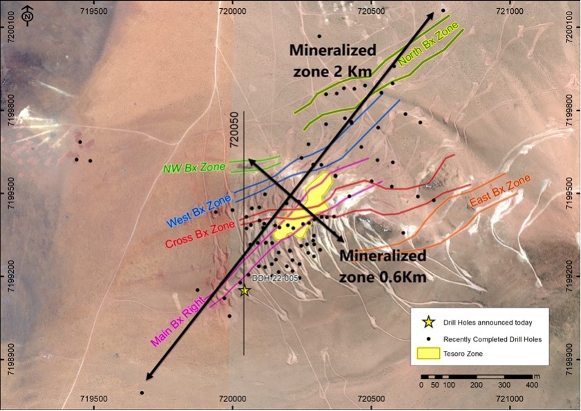 - This latest step-out hole is located southwest of the existing Oculto Mineral Resource and the mineralization now extends to an area of 600 metres by 2,000 metres and remains open along strike and at depth.