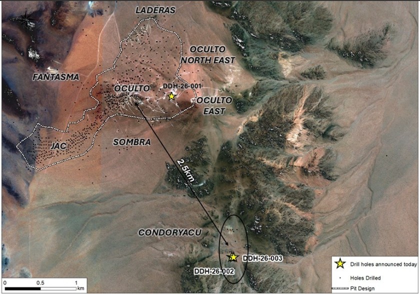 At Oculto East, the first drill hole of the Phase VI campaign (DDH 26-001) intersected a broad, continuous zone of oxide gold and silver mineralization extending beyond the limits of the current conceptual open pit, further demonstrating the scale and continuity of the overall mineralized system. Follow-up drilling is underway as part of an extensive program to expand and define gold-silver mineralization several hundred metres east of the open pit margin.