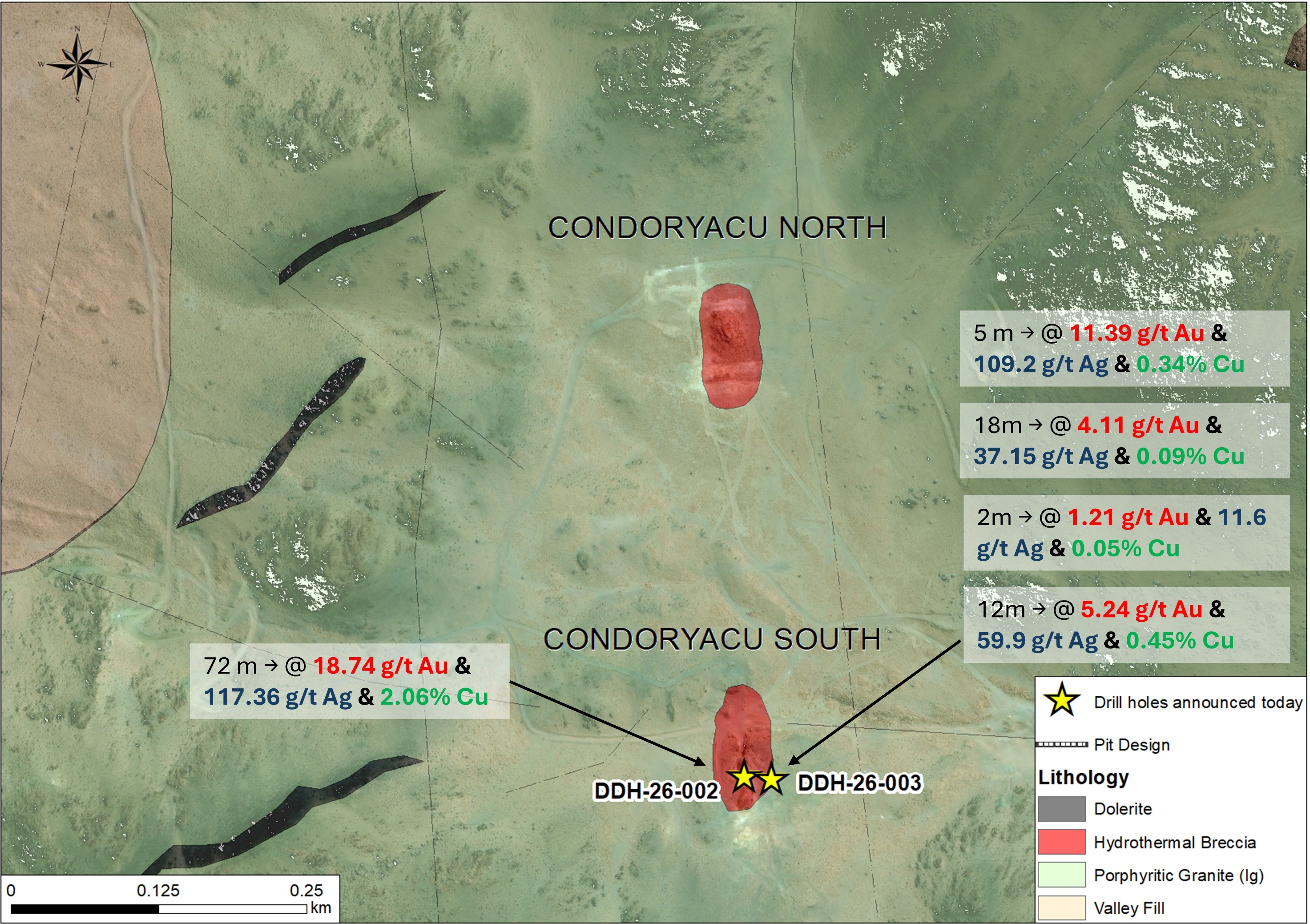 - Condoryacu: Initial confirmatory drilling from two holes at Condoryacu (DDH 26-002 and DDH 26-003) validated historic drill results that indicated the presence of high-grade mineralization beginning at surface: