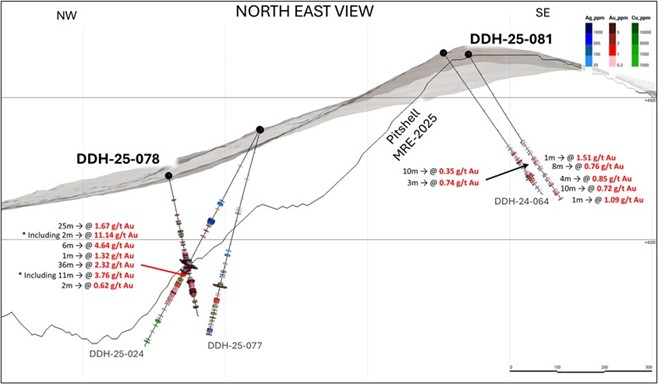 - DDH 25-081 also encountered several oxide gold zones, including: