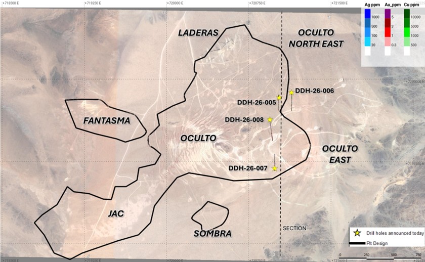 Dave O’Connor, Chief Geologist, commented, “Drilling at Oculto East continues to intersect broad zones of oxide gold and silver mineralization beyond the current Mineral Resource boundary. The presence of higher-grade intervals within these broader zones supports our geological interpretation and highlights the potential to increase Mineral Resources in this area.”