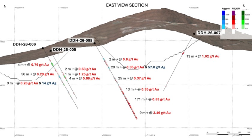 - Hole DDH 26-006 intersected multiple mineralized intervals, including a broad zone of 56.0 m grading 0.29 g/t gold and 8.0 g/t silver from 109 m downhole