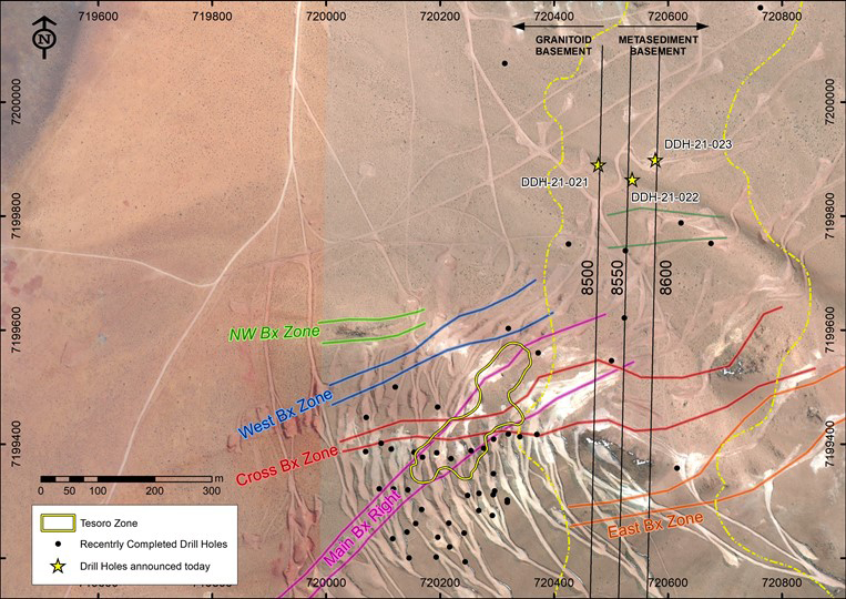 Hole DDH 21-022 intersected 53 metres of oxide mineralisation grading 2.49g/t gold and 33.3g/t silver from 192 to 245 metres, including 14 metres grading 4.84g/t Au and 47.2g/t Ag. The gold dominant mineralisation is hosted in a siliceous breccia zone to the north of and sub-parallel to those that intersect in the Tersoro Zone of the Oculto resource, demonstrating the potential for substantial extension of the mineralised system in this area.