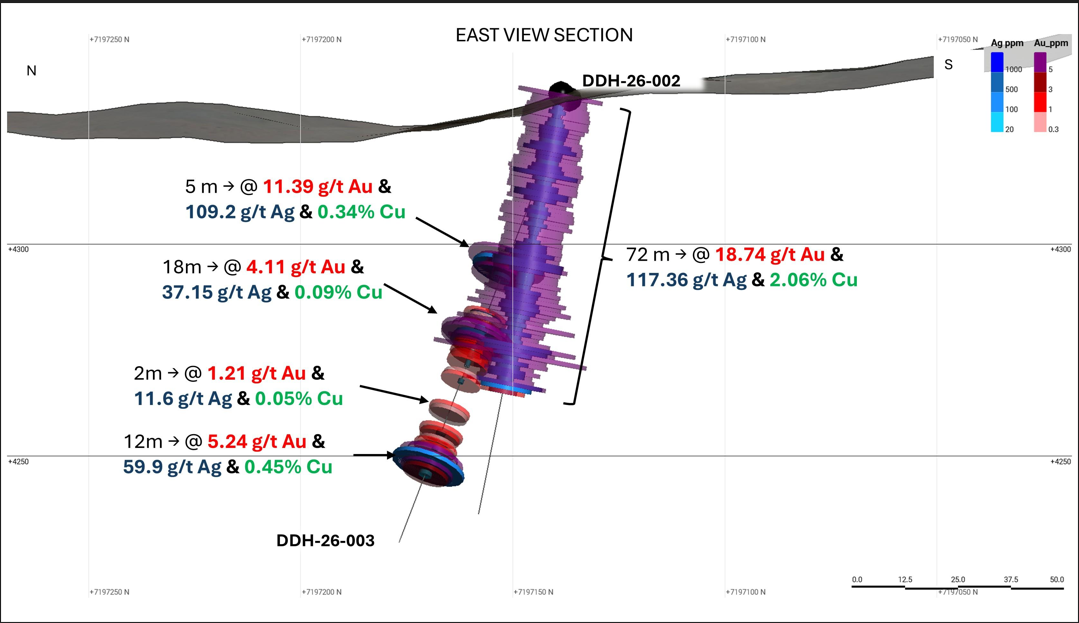 - DDH 26-002: Intercepted a broad interval of high-grade sulphide gold-silver-copper mineralization beginning at surface: