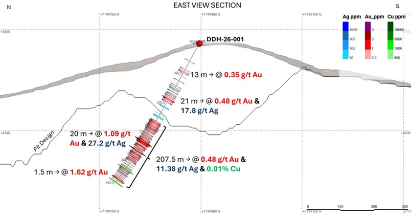 - DDH 26-001: Intercepted 207.5 metres (“m”) grading 0.48 g/t gold and 11.4 g/t silver.