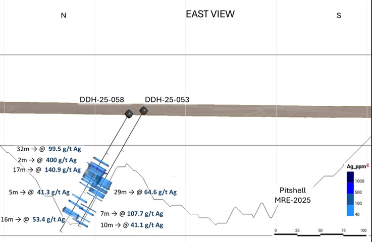 - DDH 25-058: 32.0 m at 100 g/t silver from 58 m, including 2.0 m at 400 g/t silver