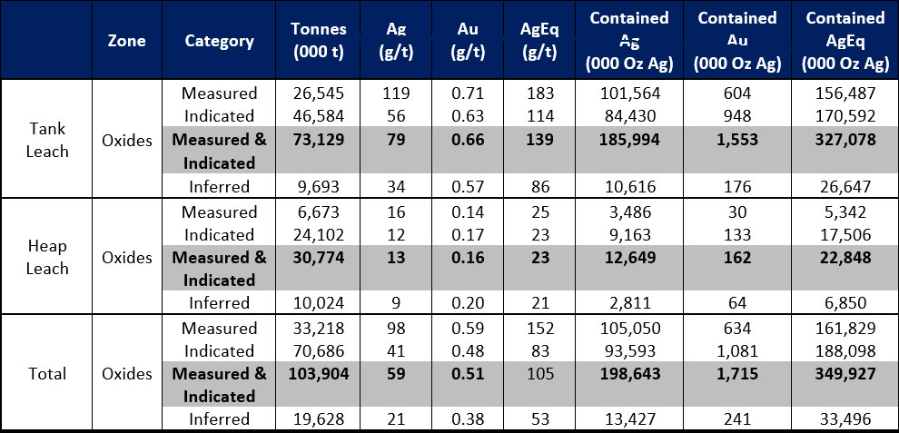 - The Mineral Resource is reported inside a conceptual Whittle open pit shell derived using US$ 27.50/oz Ag price, US $2,400/oz Au price, 83% process recovery for Ag, and 87% process recovery for Au.